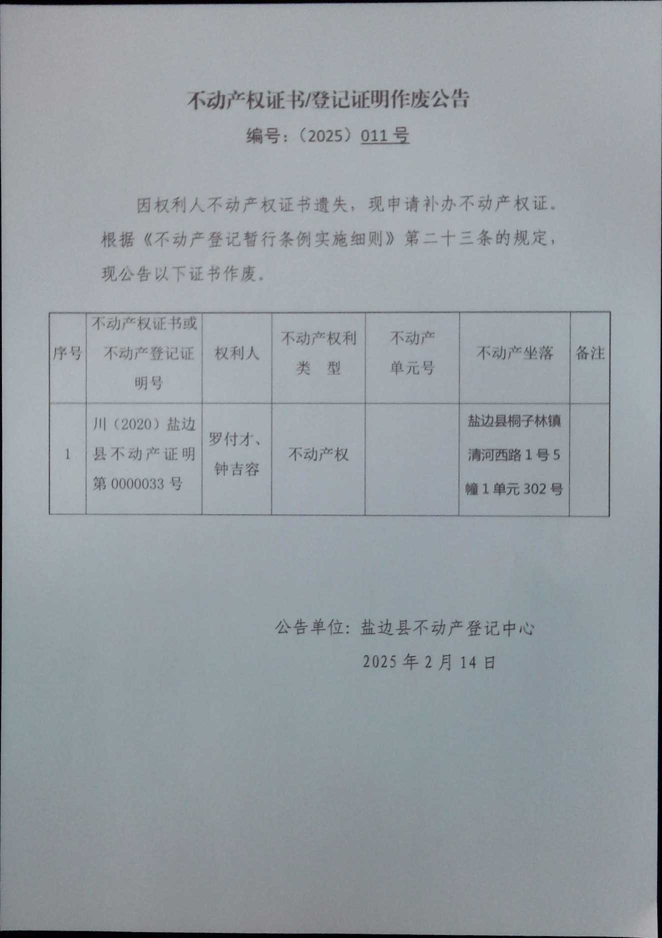 不动产权证书作废公告(2025)第011号