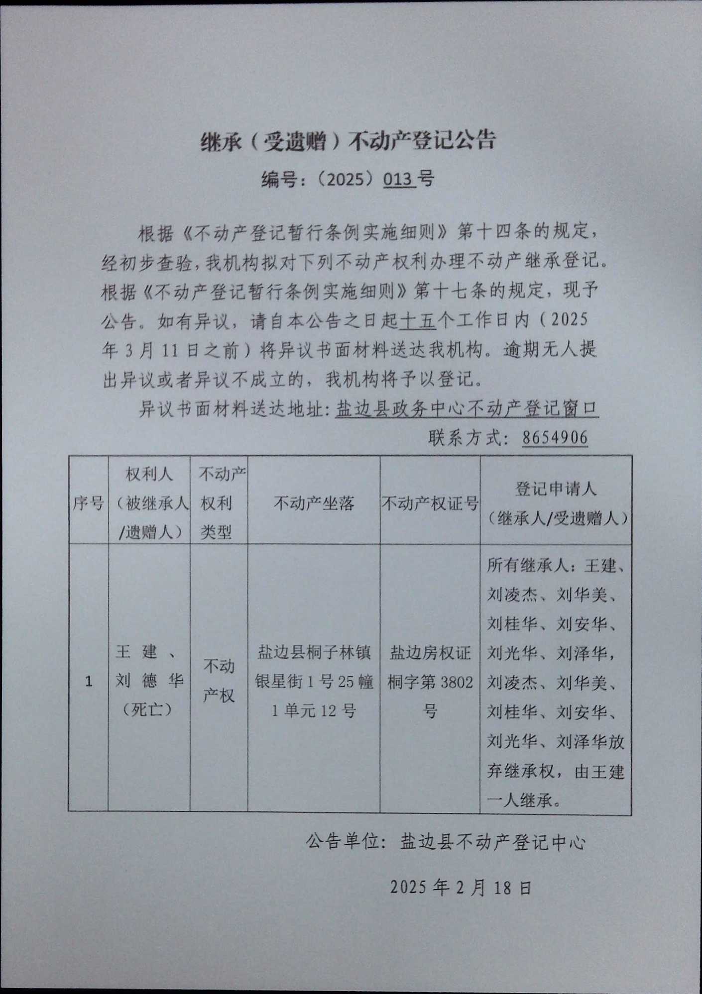 不动产继承登记公告(2025)第013号
