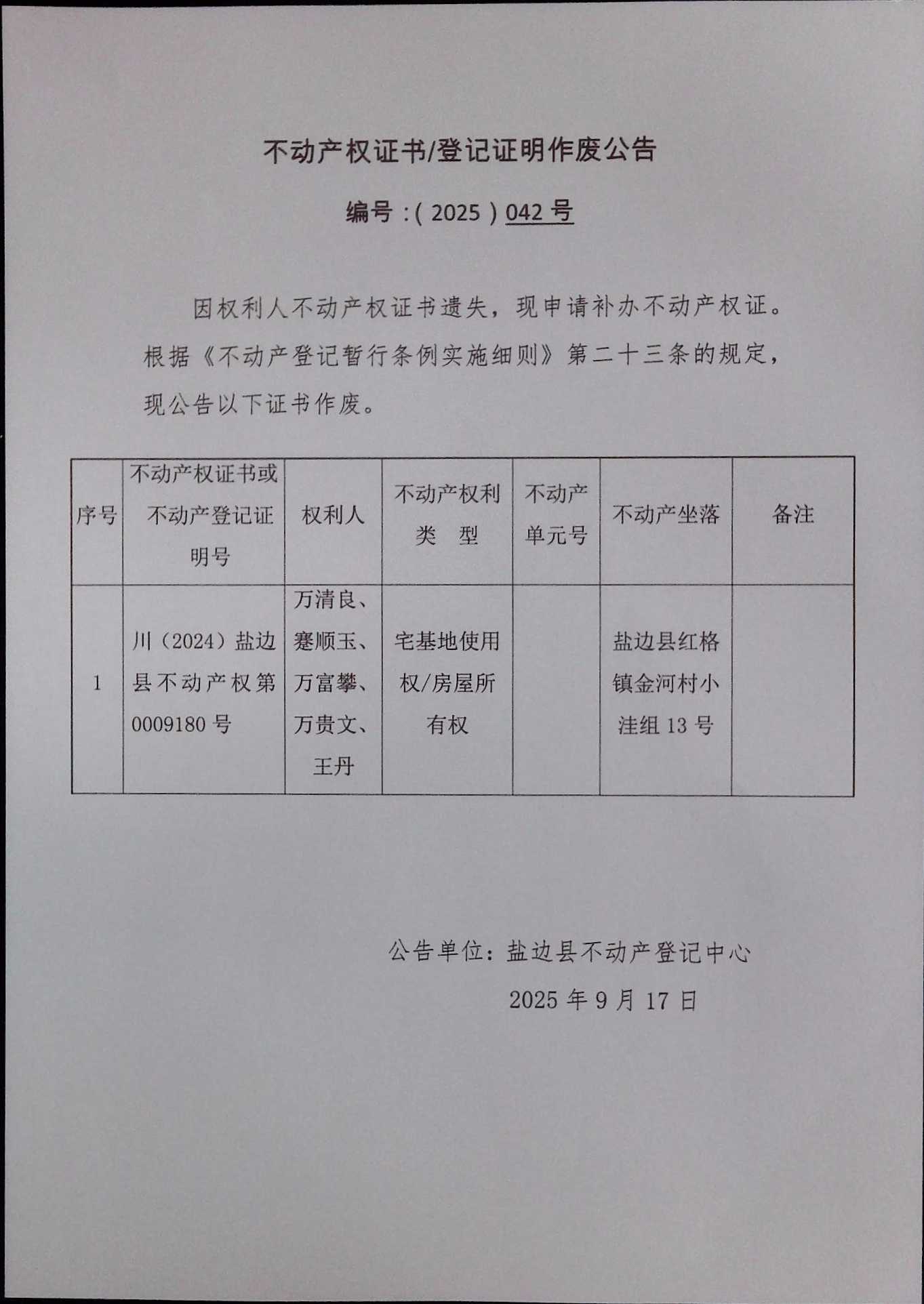 不动产权证书作废公告(2025)第042号