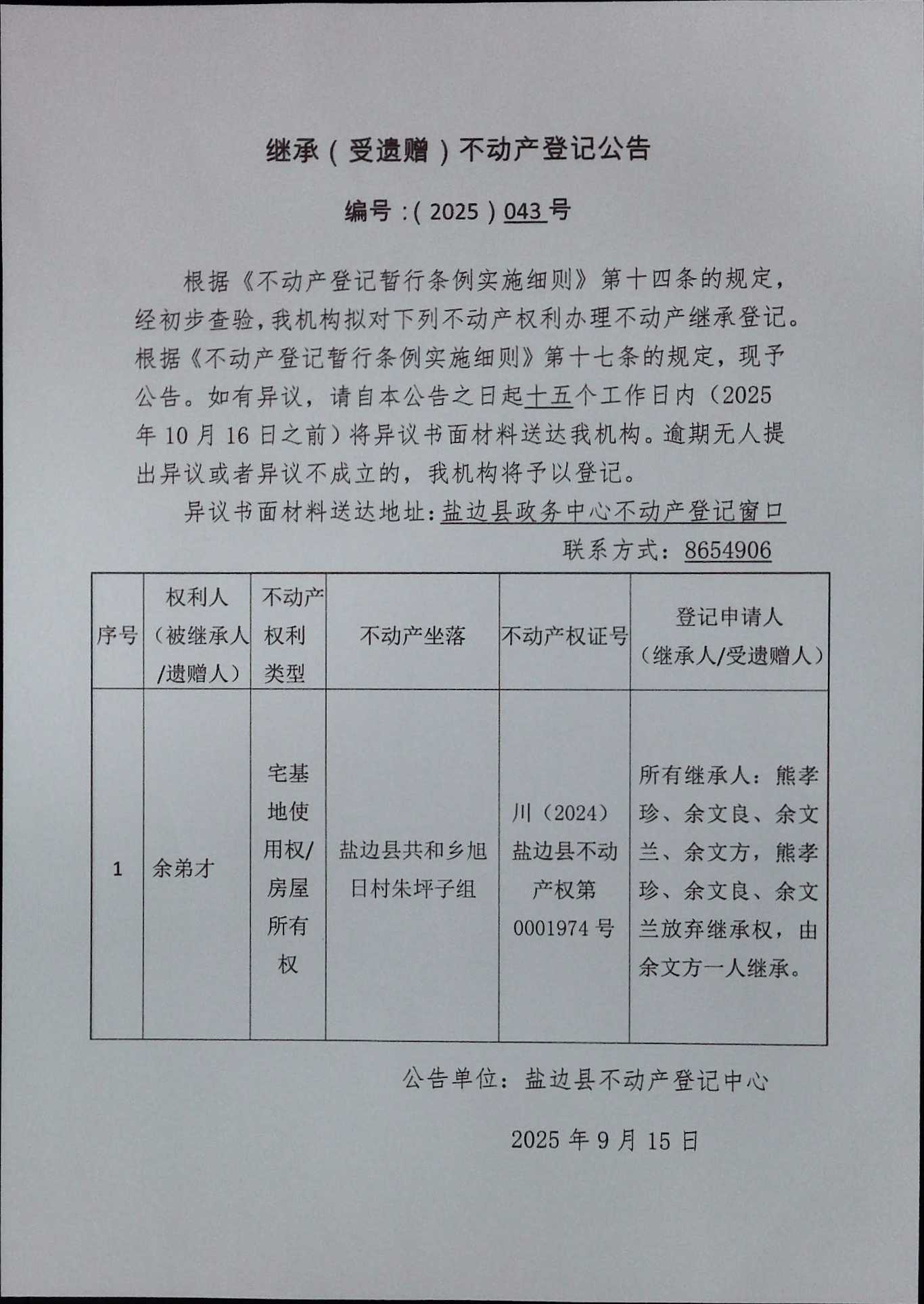 不动产继承登记公告(2025)第043号