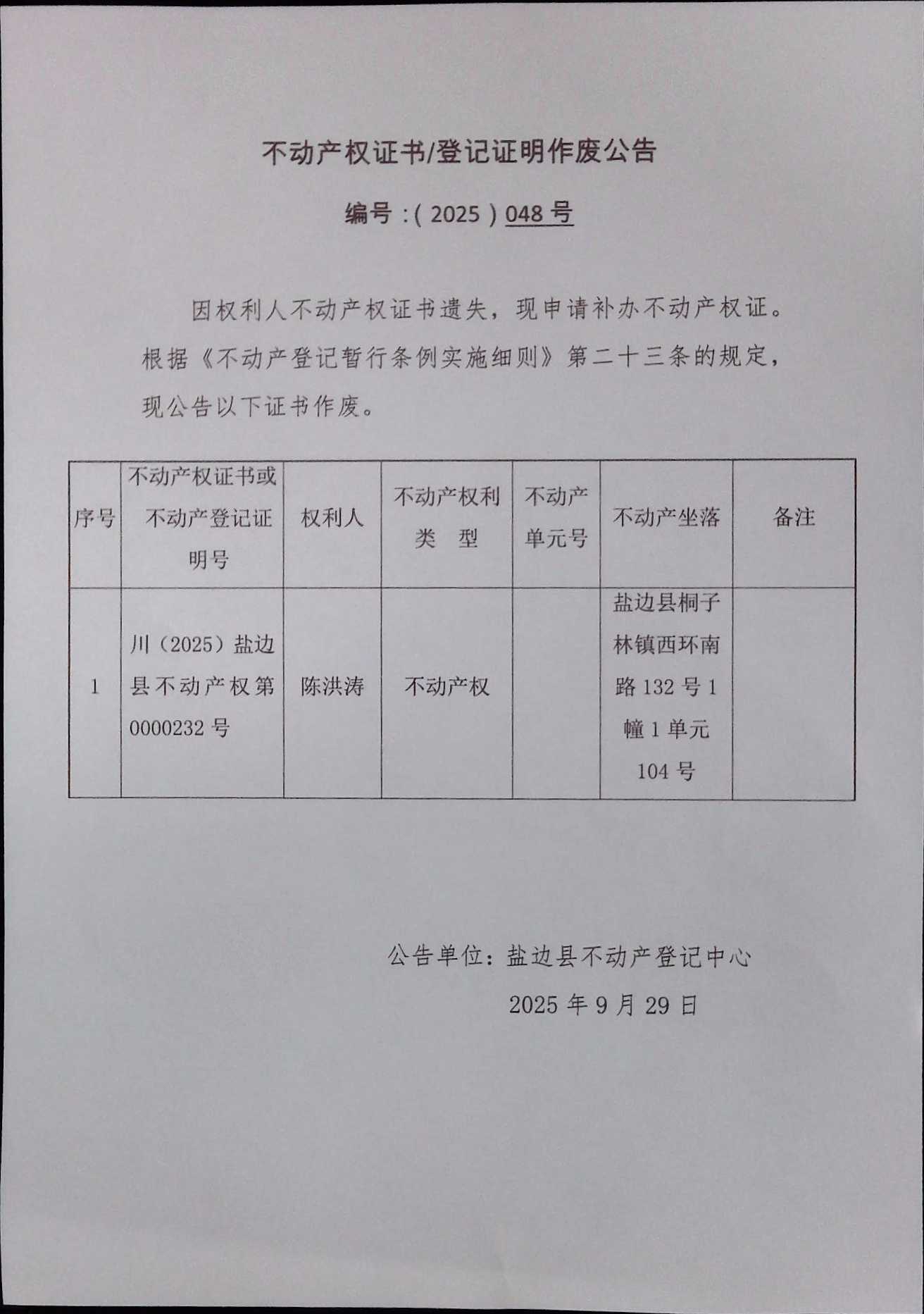 不动产权证书作废公告(2025)第048号