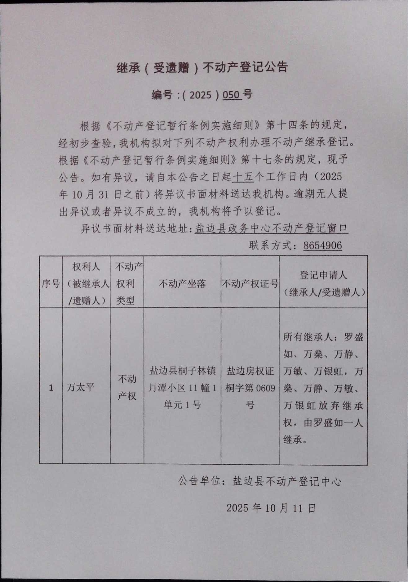不动产继承登记公告(2025)第050号