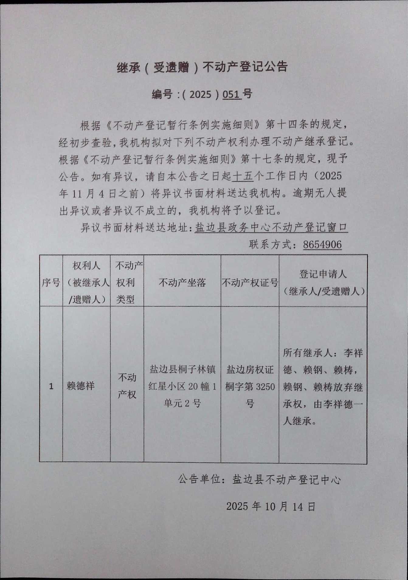 不动产继承登记公告(2025)第051号