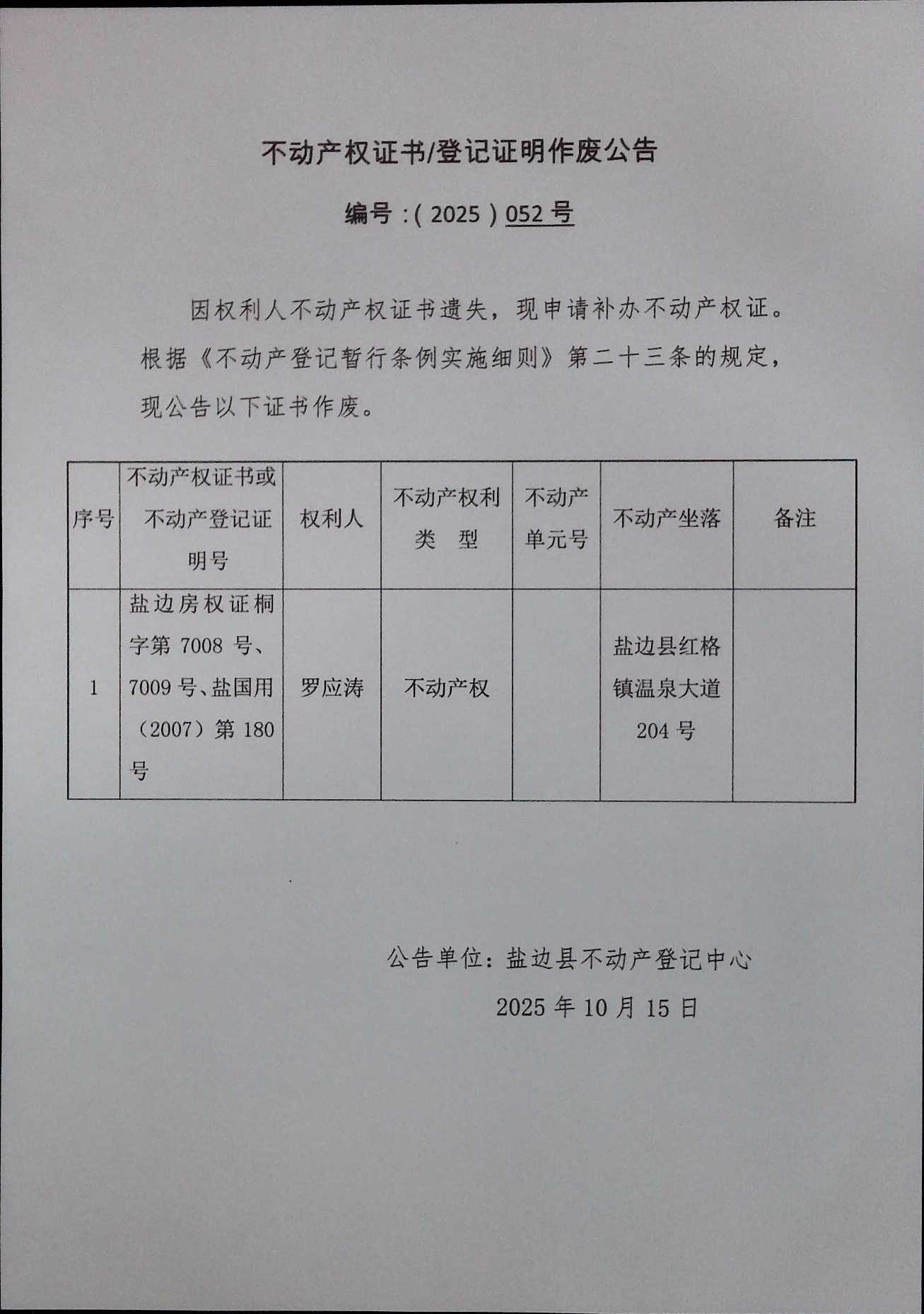 不动产权证书作废公告(2025)第052号