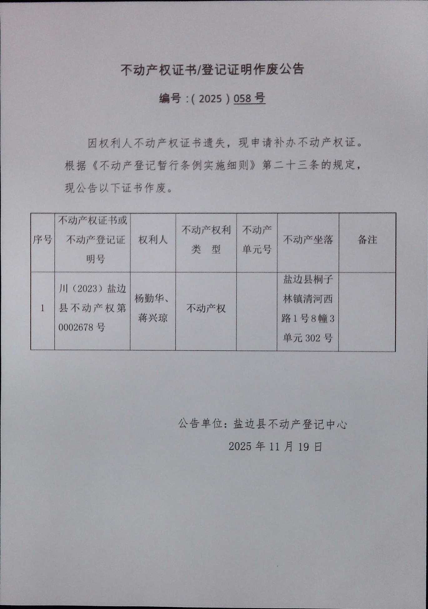 不动产权证书作废公告(2025)第058号