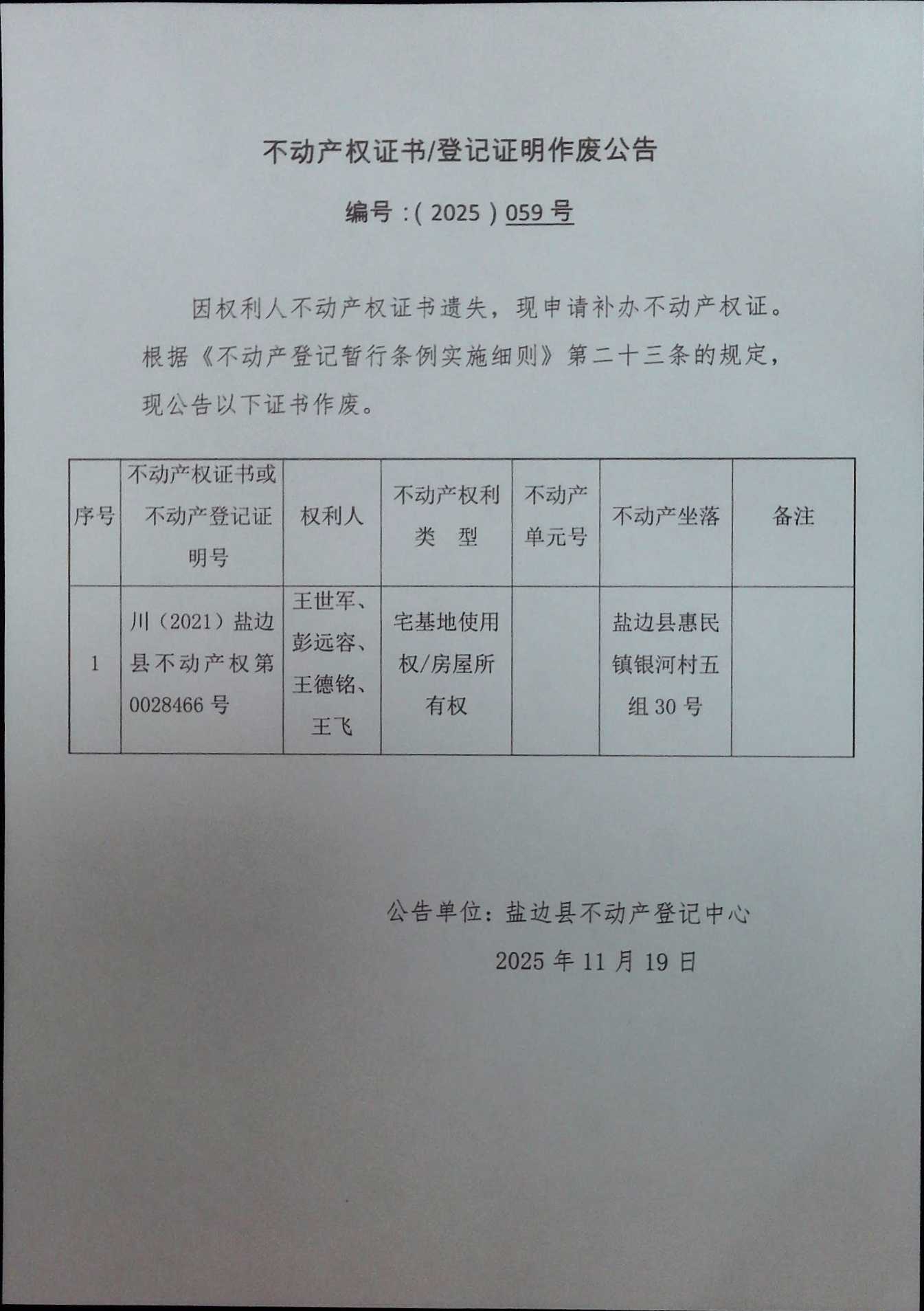 不动产权证书作废公告(2025)第059号
