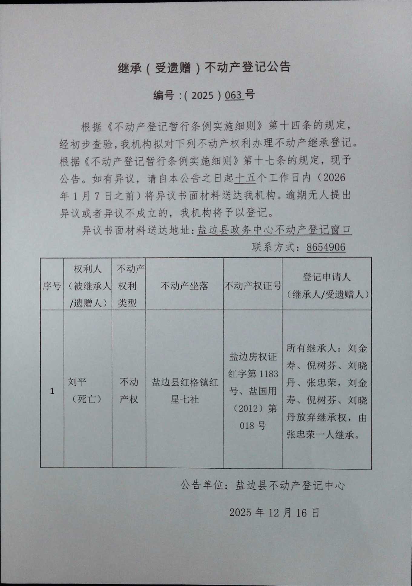 不动产继承登记公告(2025)第063号