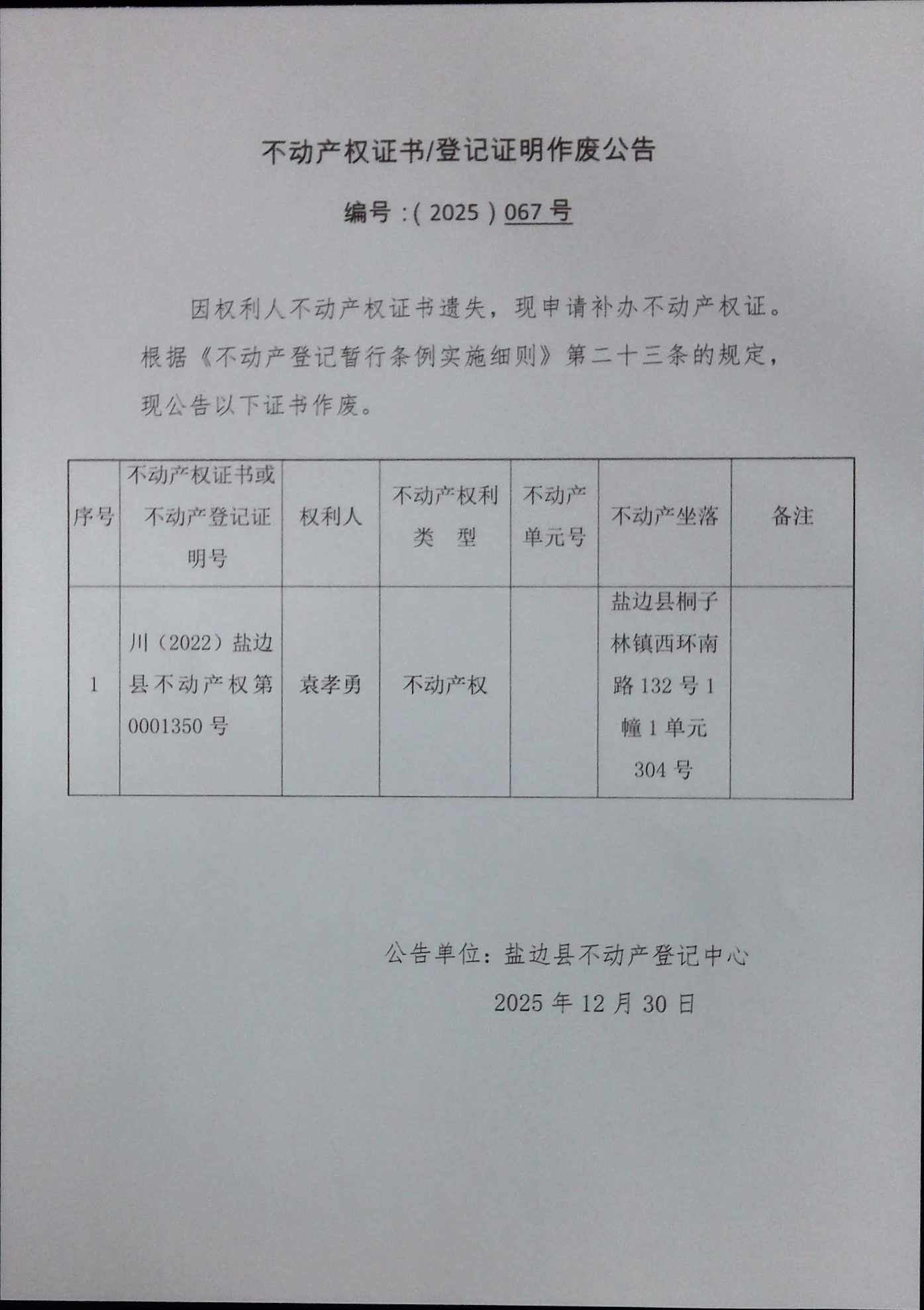 不动产权证书作废公告(2025)第067号