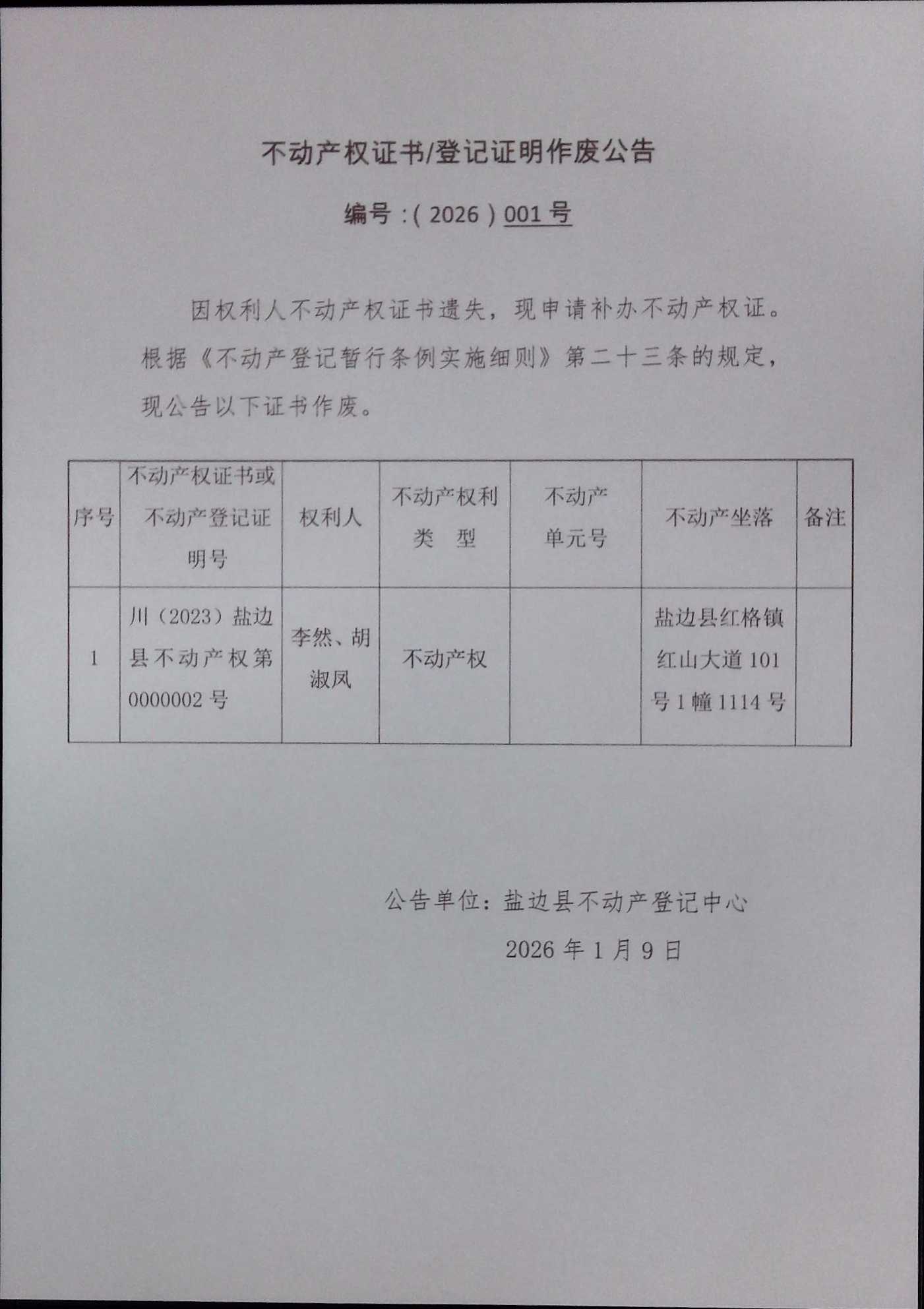 不动产权证书作废公告(2026)第001号