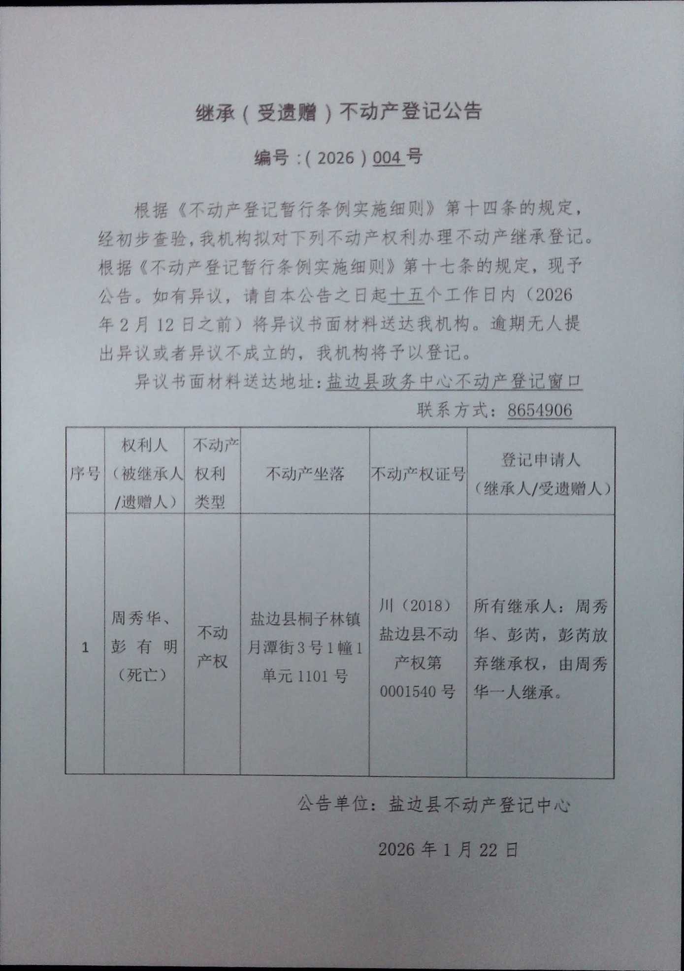 不动产继承登记公告(2026)第004号