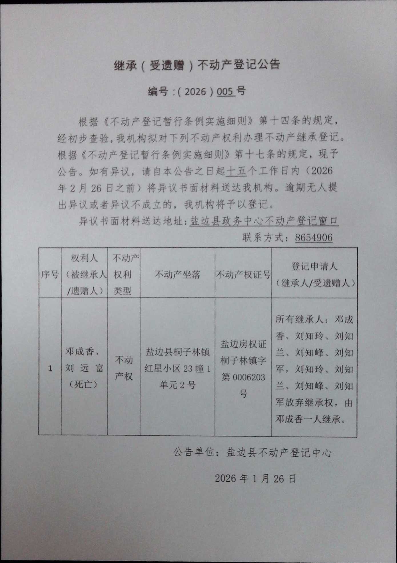 不动产继承登记公告(2026)第005号