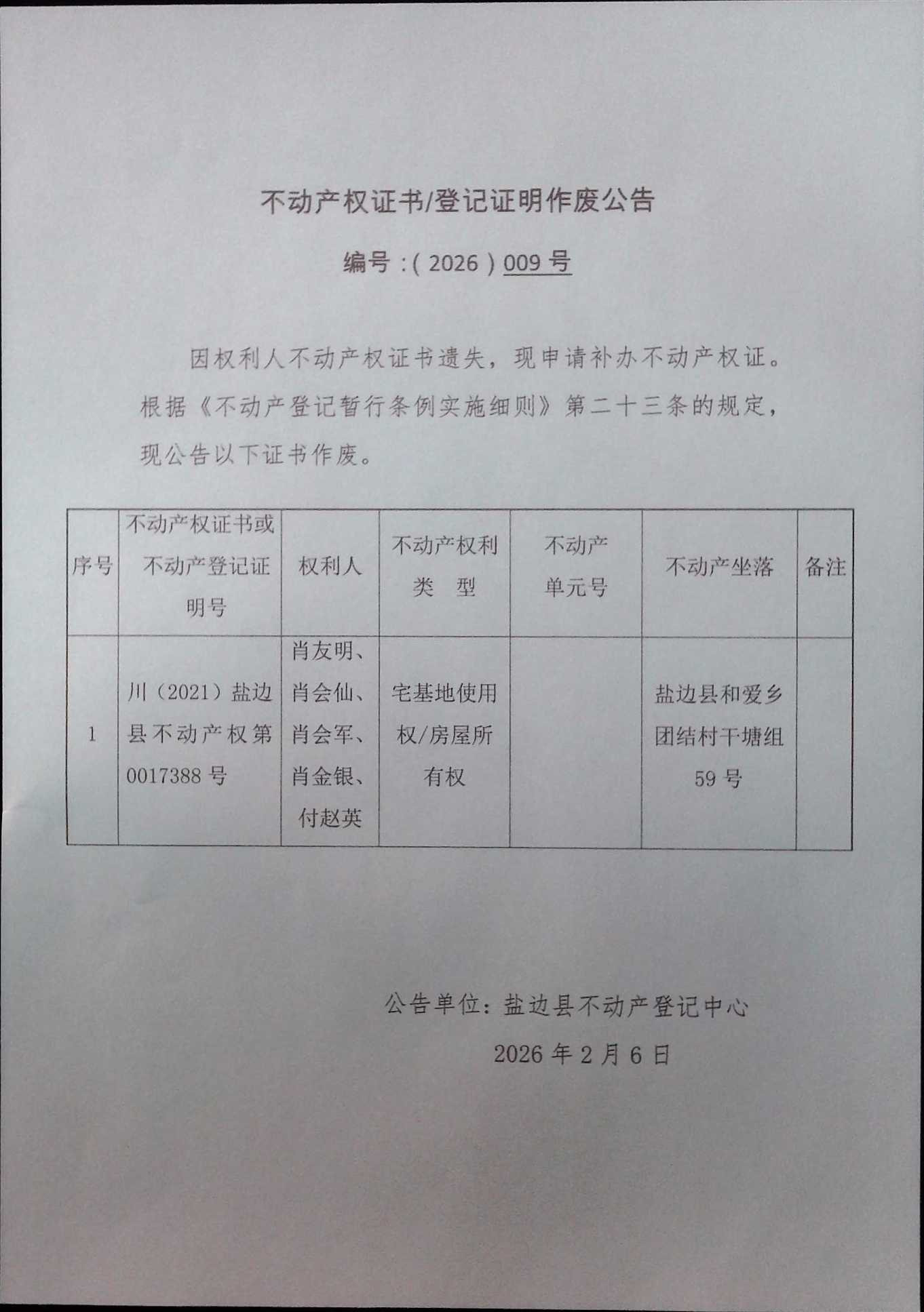 不动产权证书作废公告(2026)第009号