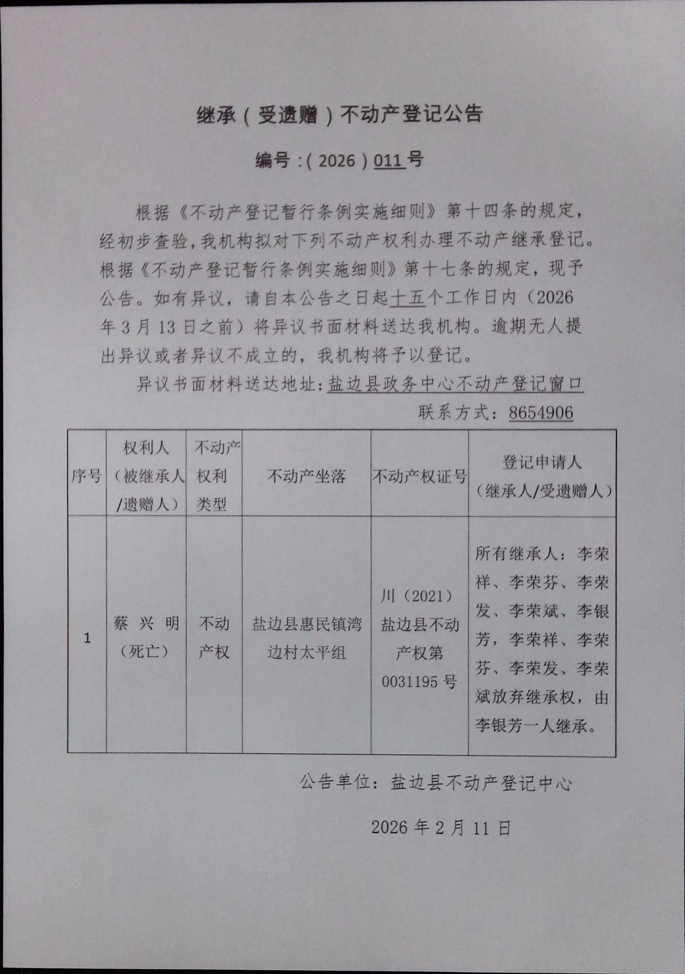 不动产继承登记公告(2026)第011号