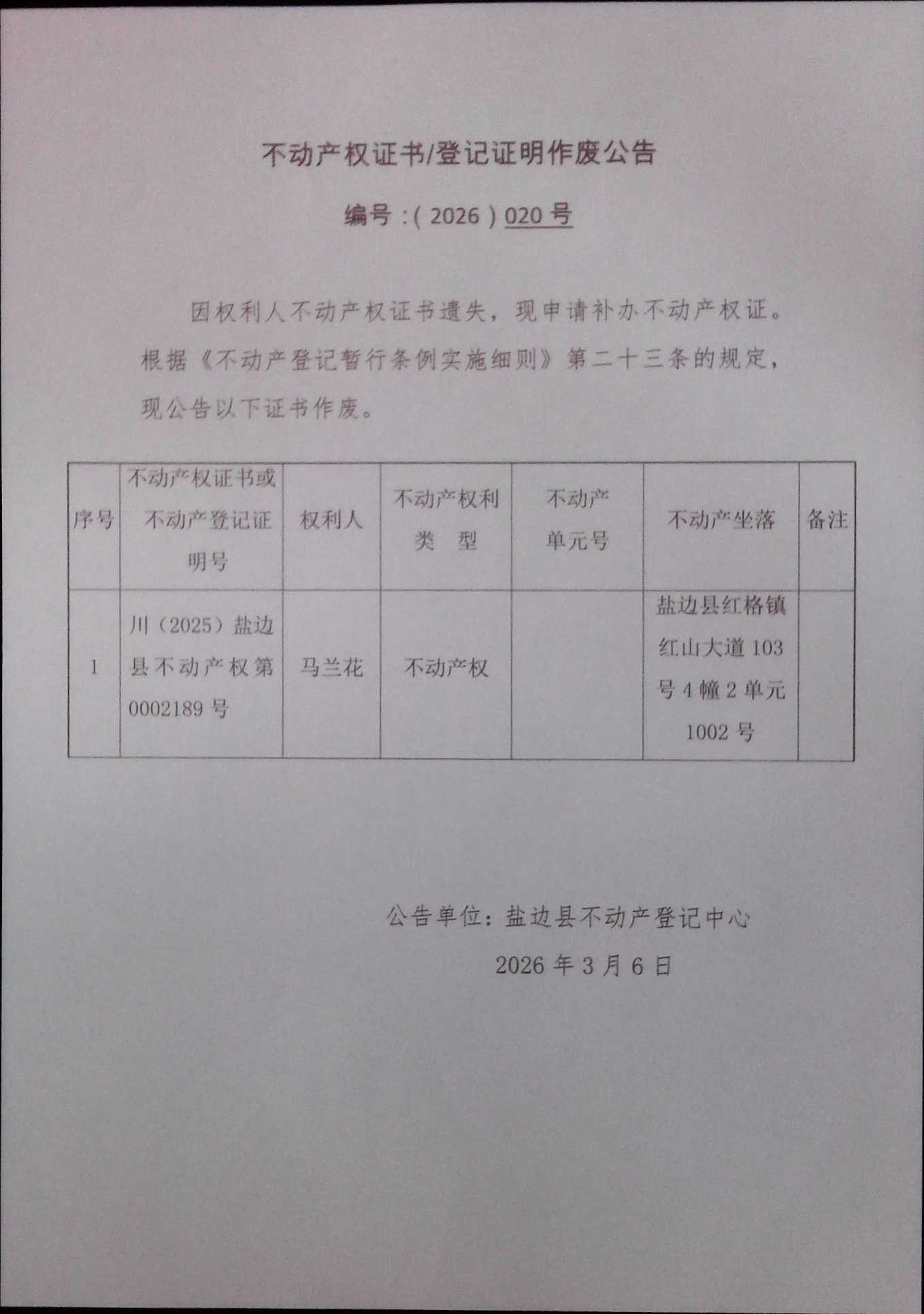 不动产权证书作废公告(2026)第020号