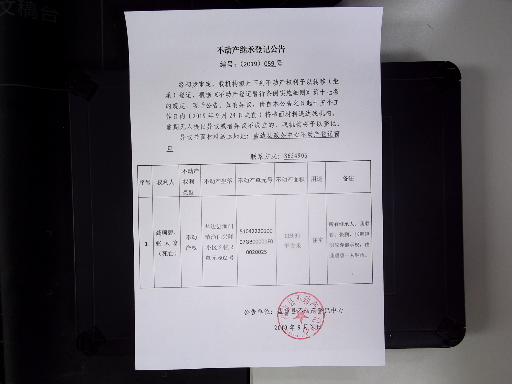不动产继承登记公告(2019)第059号
