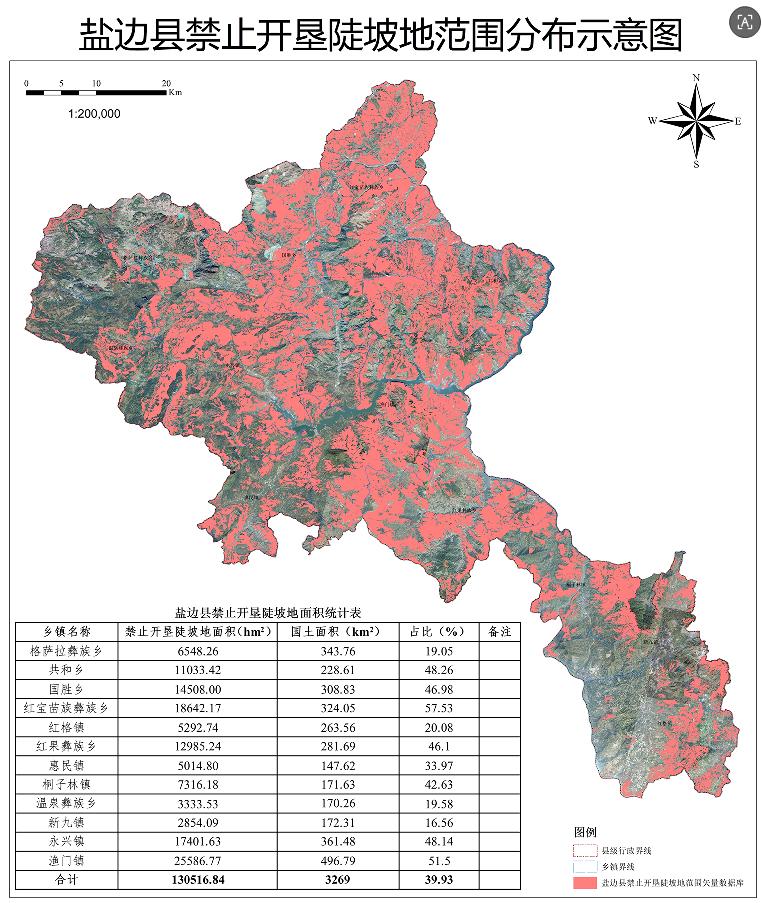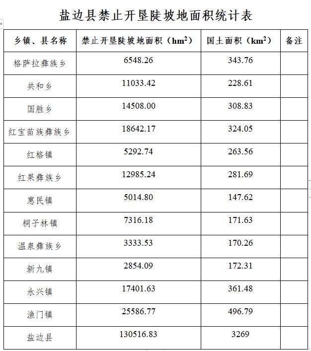 三、全县划定禁止开垦陡坡地面积130516.83公顷,其中格萨拉彝族乡6548.26公顷、共和乡11033.42 公顷、国胜乡14508.00 公顷、红宝苗族彝族乡18642.17 公顷、红格镇5292.74 公顷、红果彝族乡12985.24 公顷、惠民镇5014.80 公顷、桐子林镇7316.18 公顷、温泉彝族乡3333.53 公顷、新九镇2854.09 公顷、永兴镇17401.63公顷、渔门镇25586.77 公顷。禁止开垦陡坡范围可到盐边县水利局查询(地址:盐边县东环北路36号;电话:0812-3968047)。