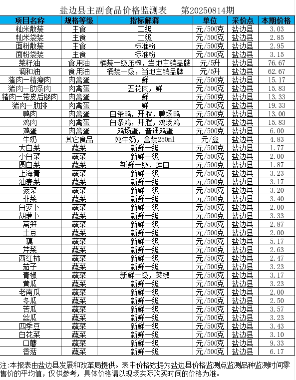 盐边县主副食品价格监测表 (第20250814期)