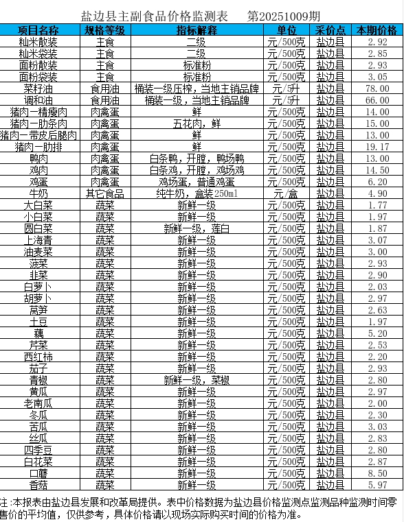 盐边县主副食品价格监测表 (第20251009期)