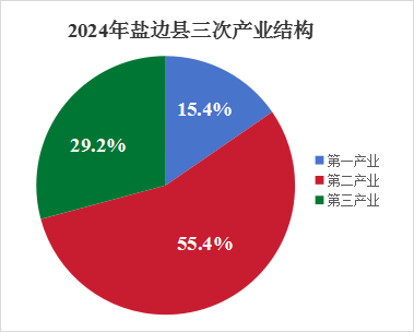 根据地区生产总值统一核算初步结果,2024年盐边县地区生产总值(GDP)191.2亿元,按可比价格计算,比上年增长7.5%。其中,第一产业增加值29.4亿元,增长3.5%,对经济增长的贡献率为8.8%,拉动经济增长0.7个百分点;第二产业增加值106亿元,增长7.9%,对经济增长的贡献率为55.7%,拉动经济增长4.1个百分点;第三产业增加值55.8亿元,增长9.2%,对经济增长的贡献率为35.6%,拉动经济增长2.7个百分点。三次产业结构由上年的16.9:54.3:28.8调整为15.4:55.4:29.2。