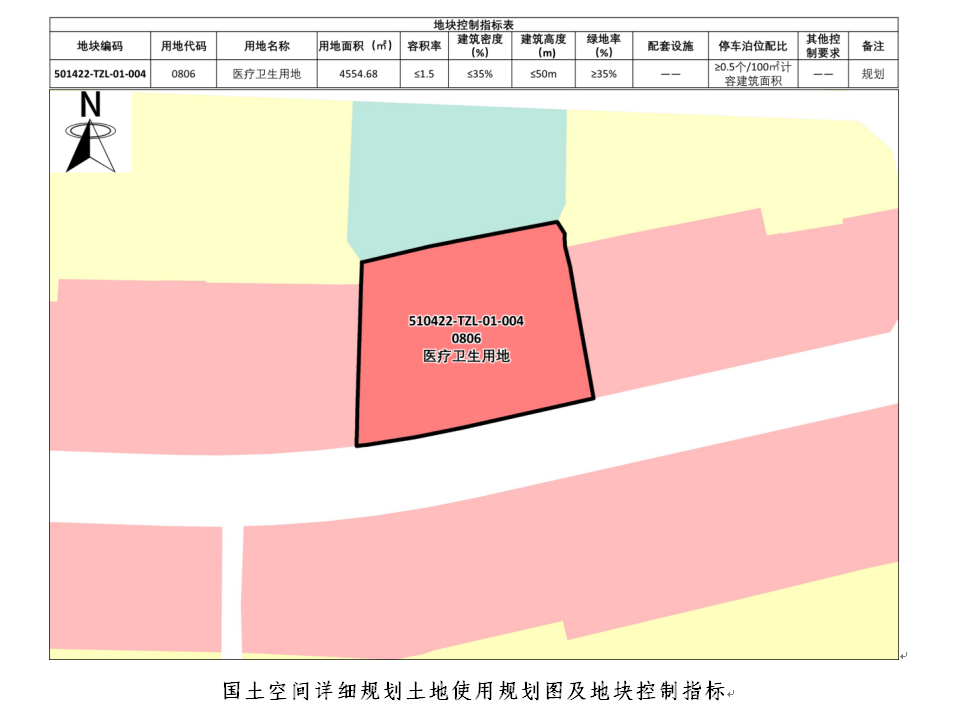 规划城镇建设用地4554.68㎡,依据《国土空间调查、规划、用途管制用地用海分类指南》(自然资发〔2023〕234号),规划明确地块用地性质为医疗卫生用地,用地代码为0806。