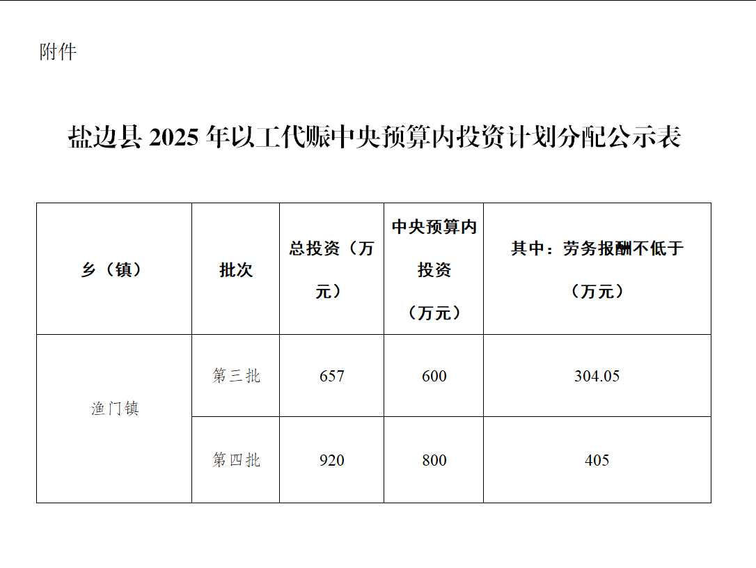根据《四川省发展和改革委员会关于分解下达2025年第三批以工代赈中央预算内投资计划的通知》(川发改投资〔2025〕346号)、《四川省发展和改革委员会关于分解下达2025年第四批以工代赈中央预算内投资计划的通知》(川发改投资〔2025〕627号)文件,转下达盐边县2025年以工代赈中央预算内资金计划1940万元,其中:第三批下达1140万元,第四批下达800万元。现将1940万元资金计划分配情况予以公告。
