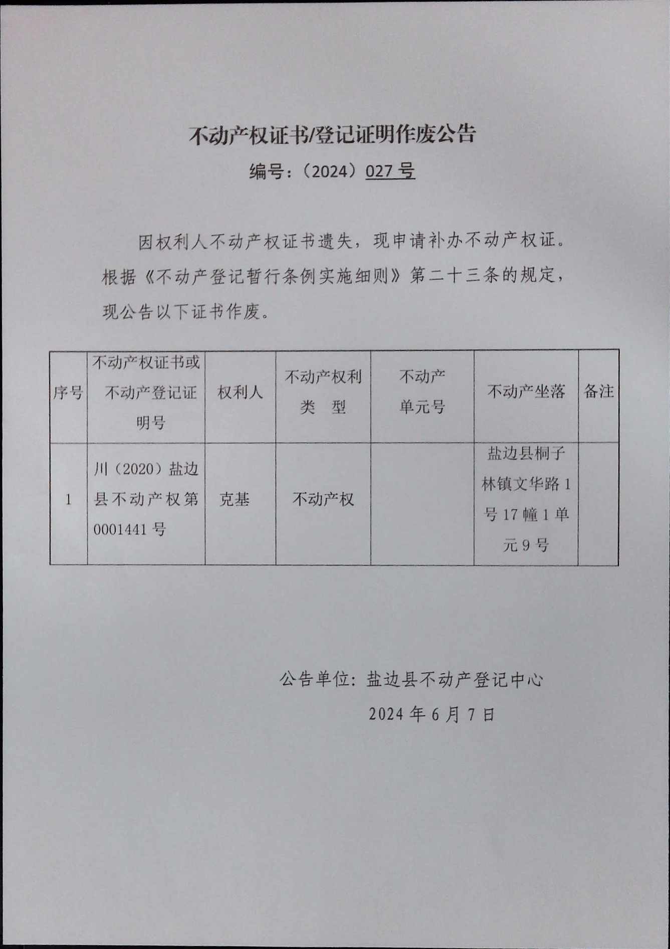不动产权证书作废公告(2024)第027号