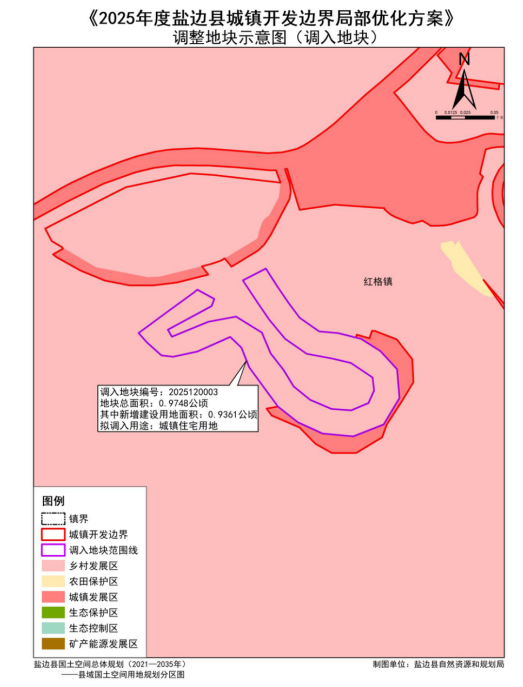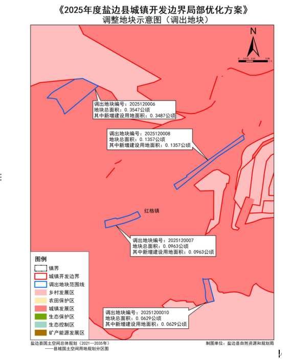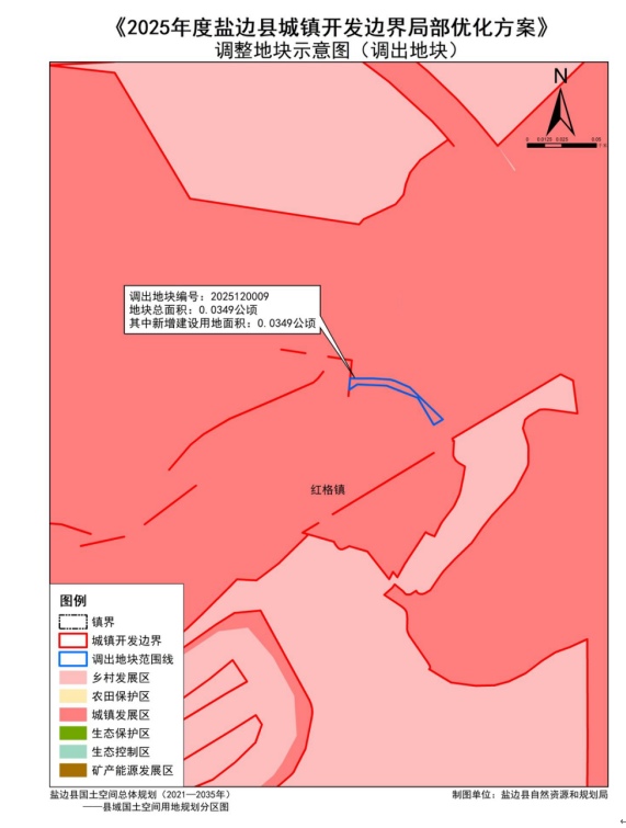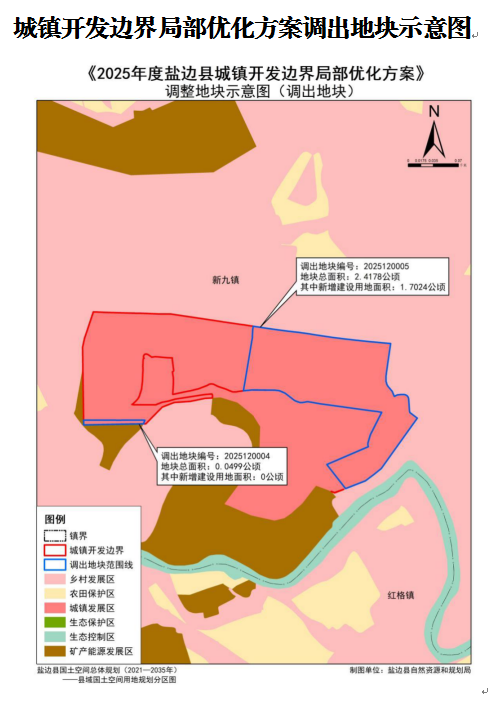 截至2025年底,盐边县共开展三次城镇开发边界局部优化方案调整,2024年度盐边县城镇开发边界优化调整调入61个地块,调入地块总面积25.0884公顷,调出地块共计2处,总面积25.0884公顷;2025年度盐边县城镇开发边界优化调整(6月份之前)调入12个地块,调入地块总面积8.0996公顷,调出地块共计7处,总面积8.0996公顷;本次盐边县城镇开发边界局部优化涉及调入地块3个,调入地块总面积3.1522公顷,涉及调出地块7个,调出地块总面积3.1522公顷。