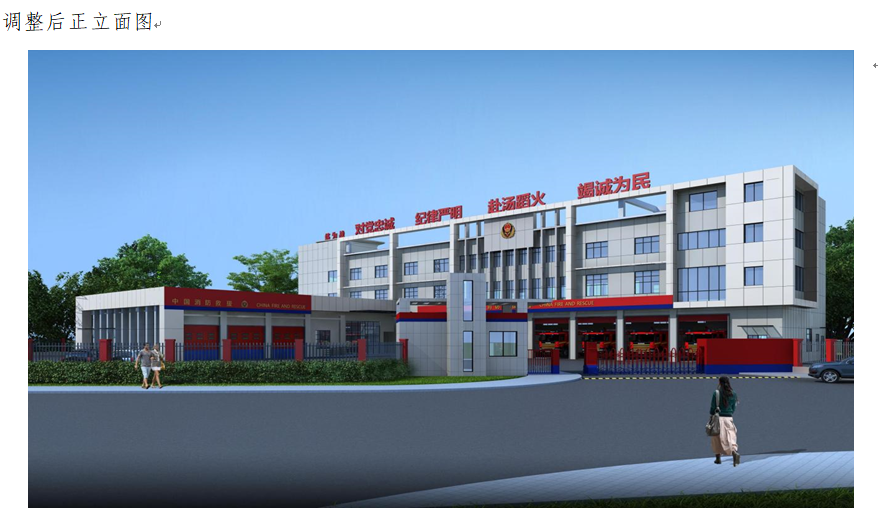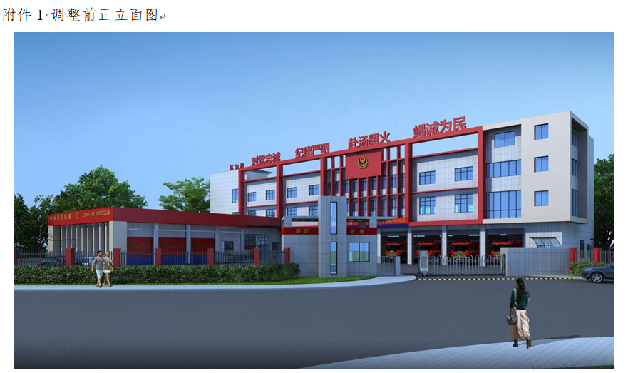 1.变更消防站主楼、训练塔及门卫室外立面颜色,由原来的红色、浅驼灰色、银白色变更为乳白色和白灰色。